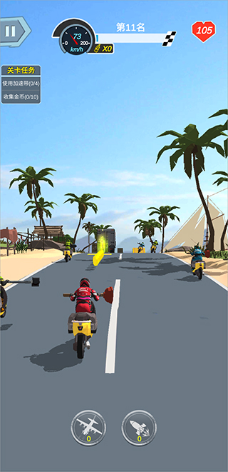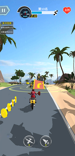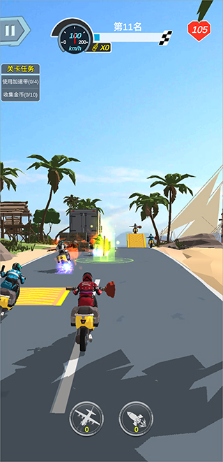 1、驾驶摩托,拾取武器攻击对手,避免其他对手的攻击。2、穿越加速带获得氮气,这样你的速度能够提升,摆脱对手的攻击。