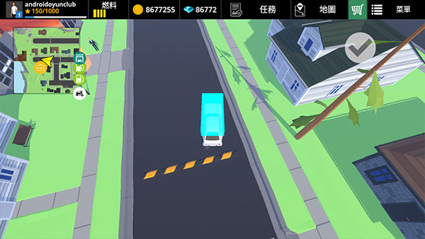 5、菜单栏上方分别为个人信息、汽车燃料、金币钻石、任务以及地图和商店,新手玩家可以先点击“任务”,根据提示完成任务,获得经验。