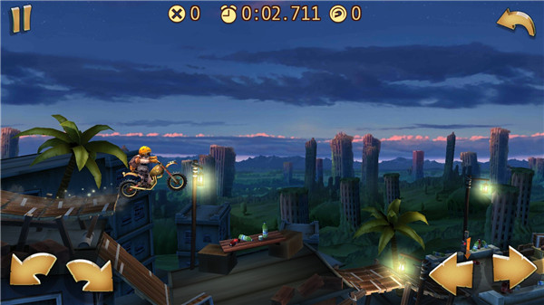 1、操作这是一款横版摩托车竞速游戏,游戏在操作上并不是重力感应,而是虚拟按键,操作手法上可能稍显普通,但是玩起来还是非常的有趣,屏幕下方有四个虚拟按键,左下角的两个控制摩托车的重心,右下角的两个按钮控制摩托车的前进与后退。操作非常的简单,玩家可以很快上手。
