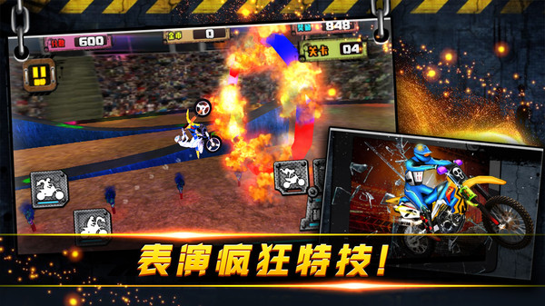 经典的摩托暴力比赛正式上线啦,如果你喜欢特技越野车,山地车这一类的游戏,那么这款游戏也是不容错过的!快来体验吧! 一个令人兴奋的摩托车特技比赛游戏!驾驶你的狂野摩托车,爬坡飞驰天空,躲避障碍、钻过火圈。积累名人积分,赚取金币兑换性能更好的摩托车!精彩的比赛场景搭配紧张刺激的音乐,数万观众为你呐喊,全景摄像机录制下你的精彩时刻!全新版本升级物理引擎,摩托车体验更加真实,平衡站立、退车、前轮左右移位、后轮转向、前轮高仰行进,专业动作加分更高!精彩赛事正式上线!全民比赛震撼开启,还在等什么,快来体验吧!