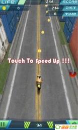 3、共五个角色,达到一定等级就会有新的角色可以使用,游戏的控制方式非常简单,重力感应来控制摩托车的方向,下方的虚拟按钮可以用来前进和用来拳打脚踢对手!
