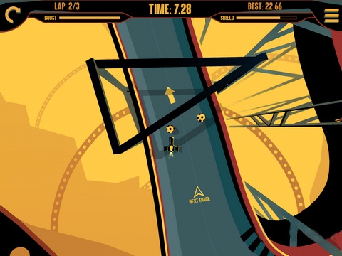 游戏的风格非常的抽象化,光影效果也非常的炫酷,画面感确实与一般的太空场景略有不同,音效方面也不是很突出,不过在关卡中挑战起来还是挺带感的,十几个关卡的挑战任务中,玩家必须在上一关有好的成绩,才能解锁下一个赛道,赛道除了更长、弯道更多之外其实也没有更多对你造成实质性障碍的物体,因为游戏本身也许就是一个障碍。