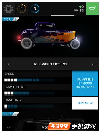 等级3的赛车在性能上又有了一定的提升,这辆万圣夜改装车是不是很拉风,速度虽然不错,可是操控性差点。