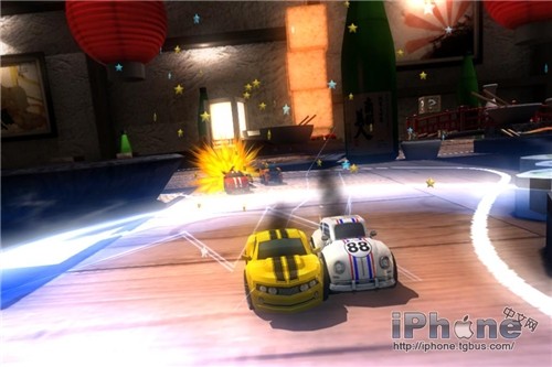 Table Top Racing是一款风格非常卡通的赛车队长游戏,赛车的造型都非常迷你,赛道也是将生活中各种桌面3D化而成的,包括中西式的餐桌、儿童的玩具桌等。玩家在游戏中的任务就是通过收集路上的道具攻击对手、保护自己和加速前进,感觉类似于跑跑卡丁车的道具赛。