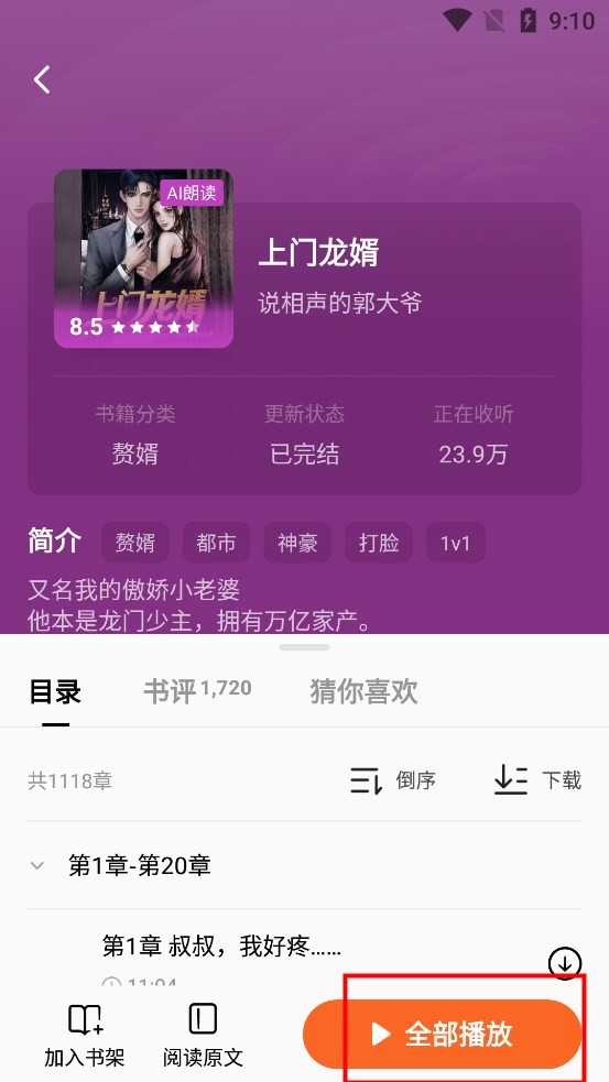 2、找到自己想要听的小说,点进去。点击全部播放,就可以免费畅听整本小说